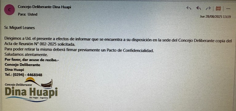El Dinahuapense solicitó copia de la misma, sin embargo, el Concejo Deliberante respondió que la entregarían previa firma de acuerdo de confidencialidad.