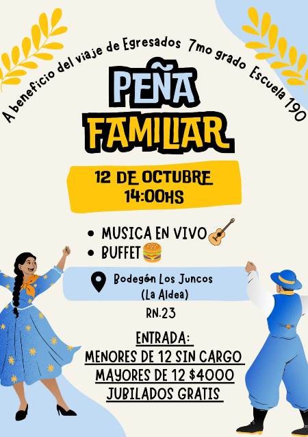 Somos familiares de alumnos de 7mo grado de la escuela rural de Ñirihuau, vamos a realizar una peña familiar con música en vivo y buffet para poder recaudar fondos para que todos los chicos de 7mo puedan concretar su viaje de egresados, estamos en una situación complicada ya que no todas las familias pueden costear el viaje, así que organizamos este encuentro.