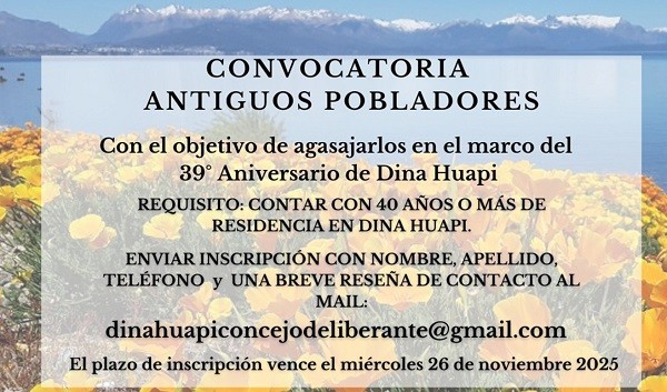 El Concejo Deliberante de Dina Huapi anuncia que está disponible la inscripción para reconocer a “Antiguos Pobladores” en el marco del 39° Aniversario de Dina Huapi.
