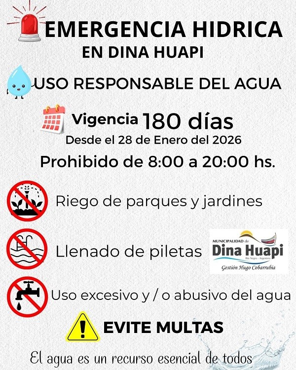 La Municipalidad de Dina Huapi informó que se encuentra vigente la emergencia hídrica en la localidad, con una duración de 180 días a partir del 28 de enero de 2026. La medida fue adoptada ante la situación crítica del recurso y tiene como objetivo garantizar el abastecimiento de agua potable para toda la comunidad.
