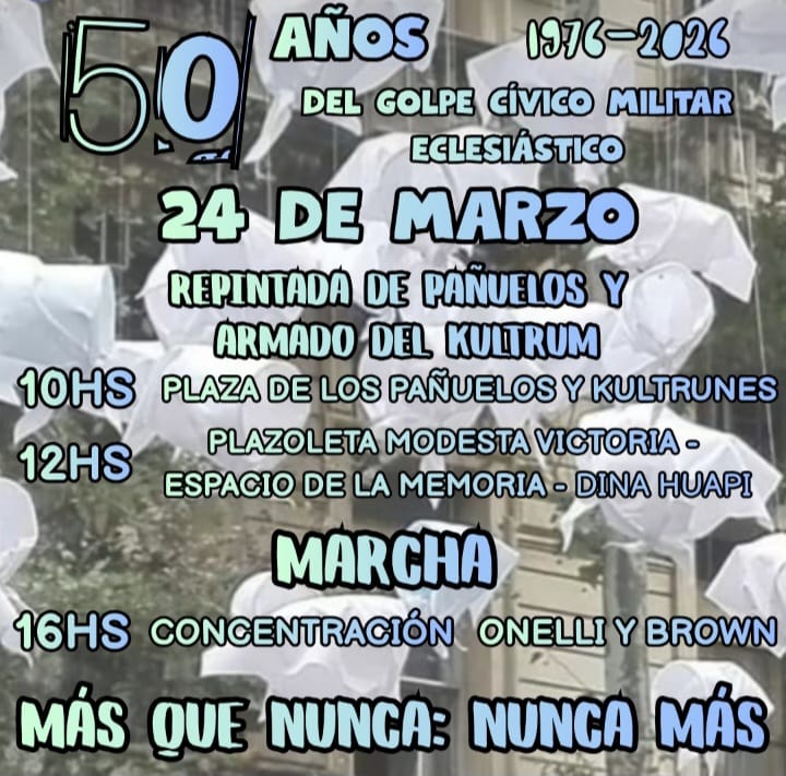 Habrá repintada de los pañuelos a las12 horas y posteriormente nos acompañarán con intervenciones artísticas: Alma Mestiza, Cantoras de aquí y de allá y Teatro por la identidad.